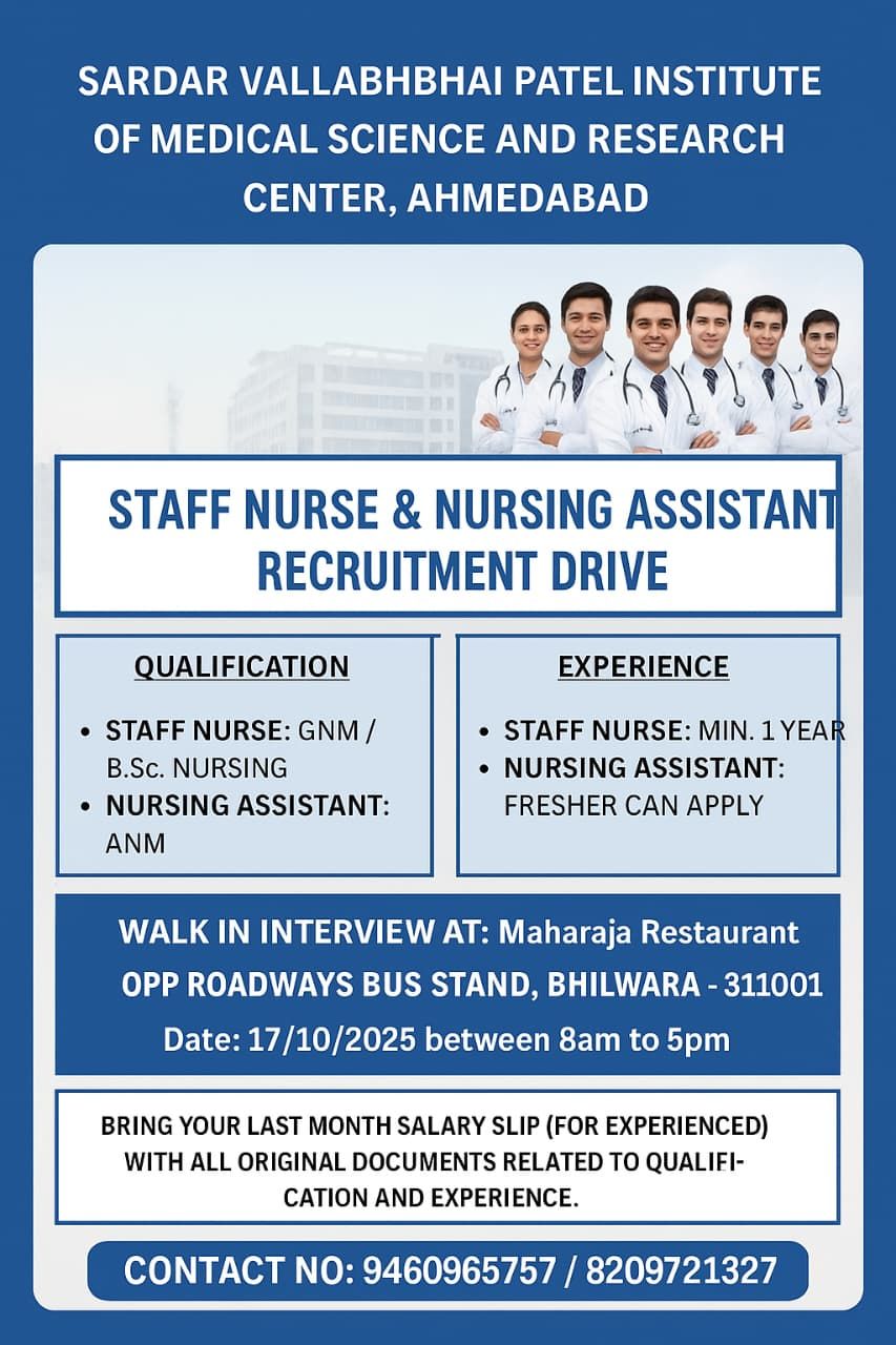 SVP Hospital Staff Nurse Vacancy 2025: Sardar Vallabhbhai Patel Institute of Medical Sciences and Research Center, Ahmedabad, has announced the latest Staff Nurse & Nursing Assistant 20 Post Jobs Notification 2025