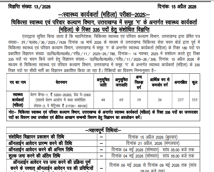 Uttarakhand ANM Vacancy 2026: UKMSSB (Uttarakhand Medical Service Selection Board) has announced the latest ANM (Female Health Worker) 335 Post Jobs notification 2026